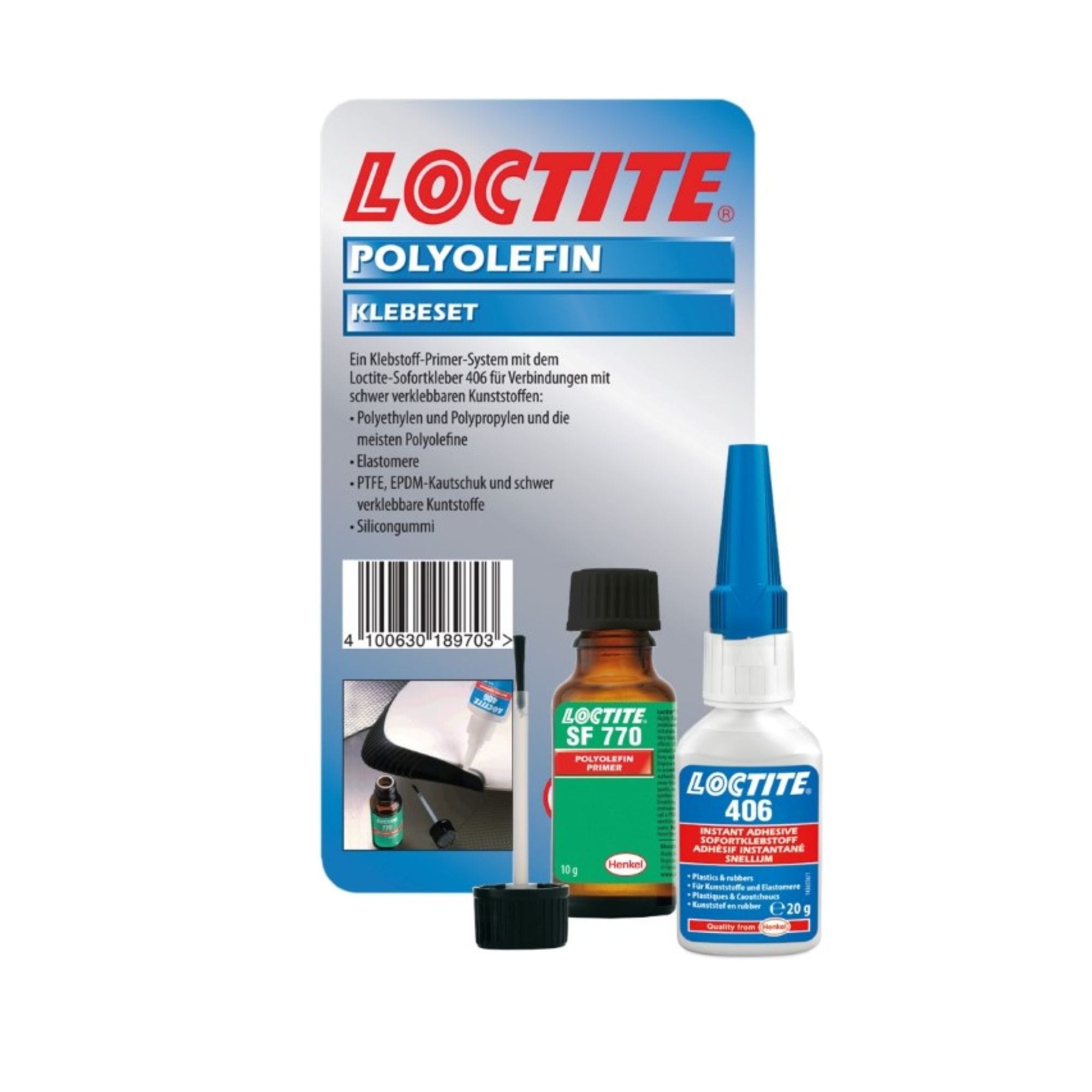 LOCTITE 770 primeren za obdelavo površin zagotavlja odličen oprijem trenutnih lepil. Primeren je za težko lepljivo plastiko in poliolefinske plastike z nizko površinsko napetostjo. Je brezbarven in izdelan na osnovi topila heptan. Poliolefinski LOCTITE 770 omogoča boljši učinek lepljenja lepila Loctite 406 na težje lepljivih podlagah, zato vam ga nudimo v setu. V ponudbi dobite Loctite 770 v 20 gramski embalaži in Loctite 406 v 10 gramskem pakiranju.